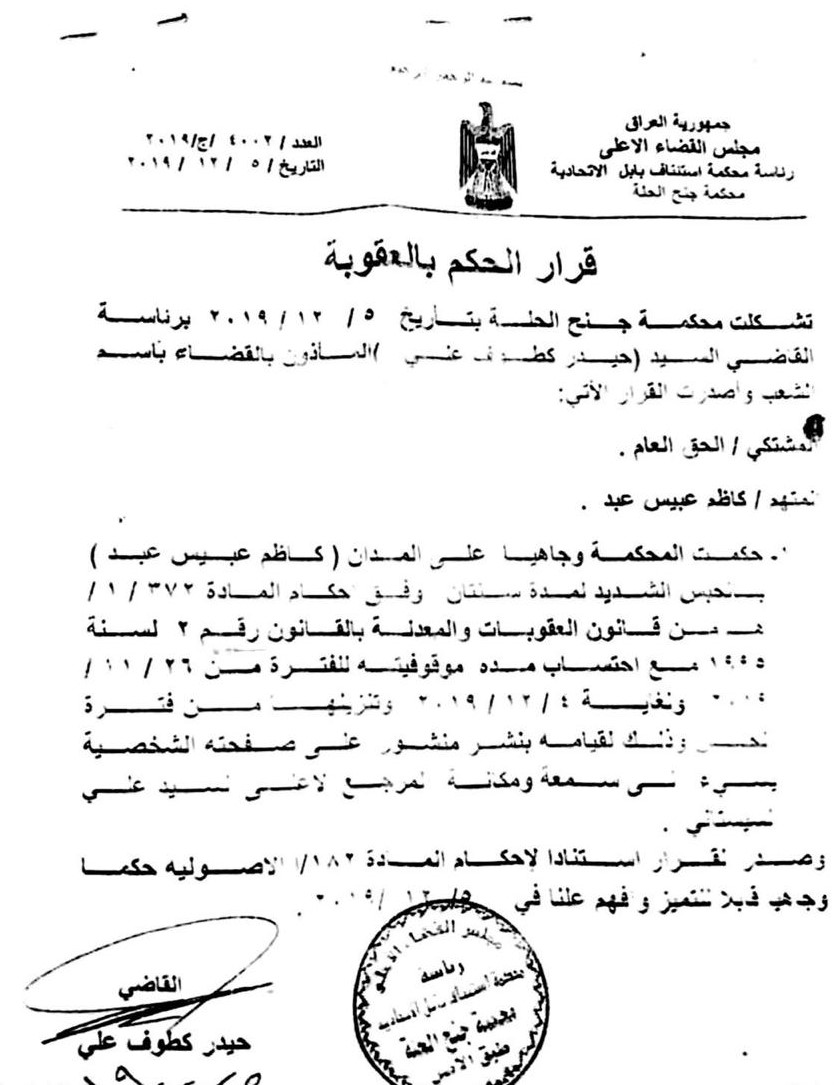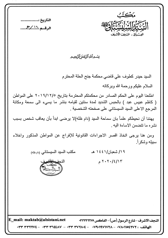 علمت (وكالة نون الخبرية) ان مكتب المرجع الديني الأعلى السيد علي السيستاني اطلع في 13 /4 /2020 على ان محكمة جنح الحلة قد حكمت على احد المواطنين بالحبس الشديد لعامين باتهام الاساءة الى المرجع الأعلى في صفحته الشخصية في الفيسبوك كما في (الوثيقة 1)