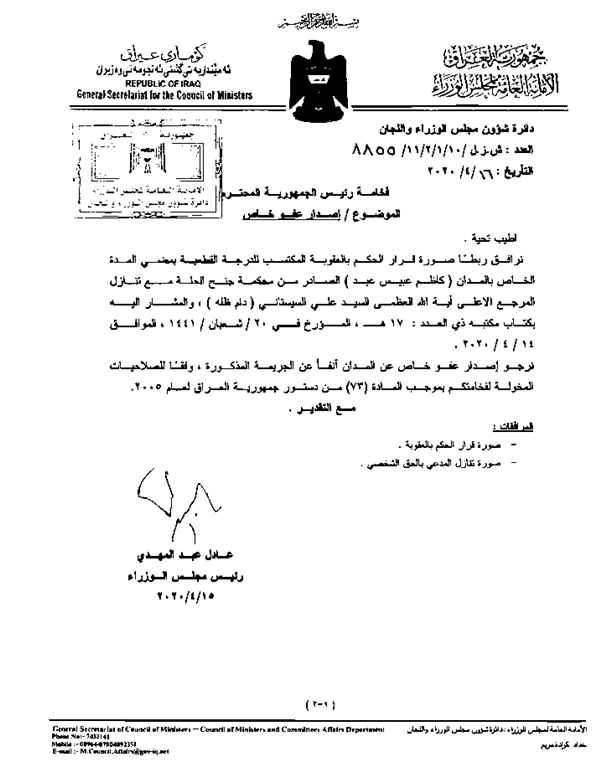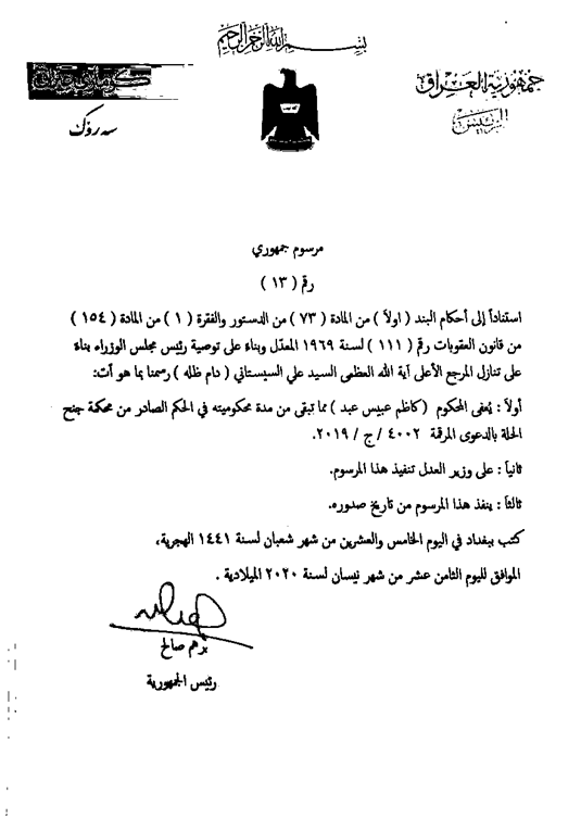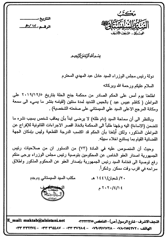 كما علمت وكالتنا ان مكتب المرجع السيستاني قد توجّه في يوم 14/4 الى رئيس مجلس الوزراء بطلب رفع توصية الى رئيس الجمهورية بالعفو عن المحكوم وفق صلاحيته الدستورية (الوثيقة 3)