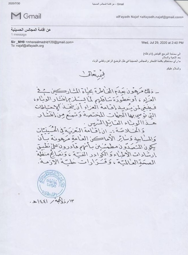 يذكر ان المرجعية الدينية العليا قد اصدرت ثلاث وصايا تخص مراسم عزاء الامام الحسين (عليه السلام) في شهر المحرم الحرام عام 1442 هـ في ظل كورونا.