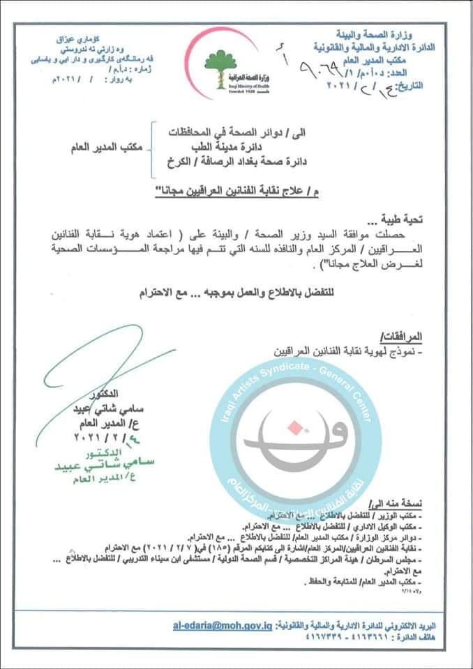 وجه وزير الصحة والبيئة الدكتور حسن التميمي الدائرة الإدارية والمالية والقانونية بعلاج الفنانين المنتمين لنقابة الفنانين العراقيين مجانا على نفقة الوزارة .