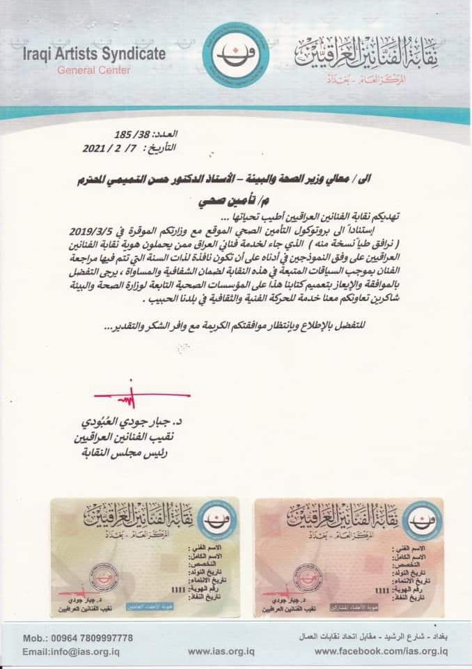 ونشرت (نقابة الفنانين العراقيين ـ المركز العام) عبر موقعها الرسمي على الفيسبوك وتابعته وكالة نون الخبرية ، إن ذلك جاء تلبية لمطالبة نقابة الفنانين العراقيين بمجلسها الحالي الذي يترأسه الدكتور جبار جودي نقيب الفنانين العراقيين وايعاز حقيقي من الحكومة العراقية للاهتمام بالفنان لما قدمه من عطاء فني ثر في ساحة الالق والابداع . وتضمنت الموافقة اعتماد هوية نقابة الفنانين العراقيين والنافذة للسنة التي تتم فيها مراجعة المؤسسات الصحية لغرض العلاج مجانا في عموم مؤسساتنا الصحية بالعاصمة بغداد و المحافظات العراقية كافة .