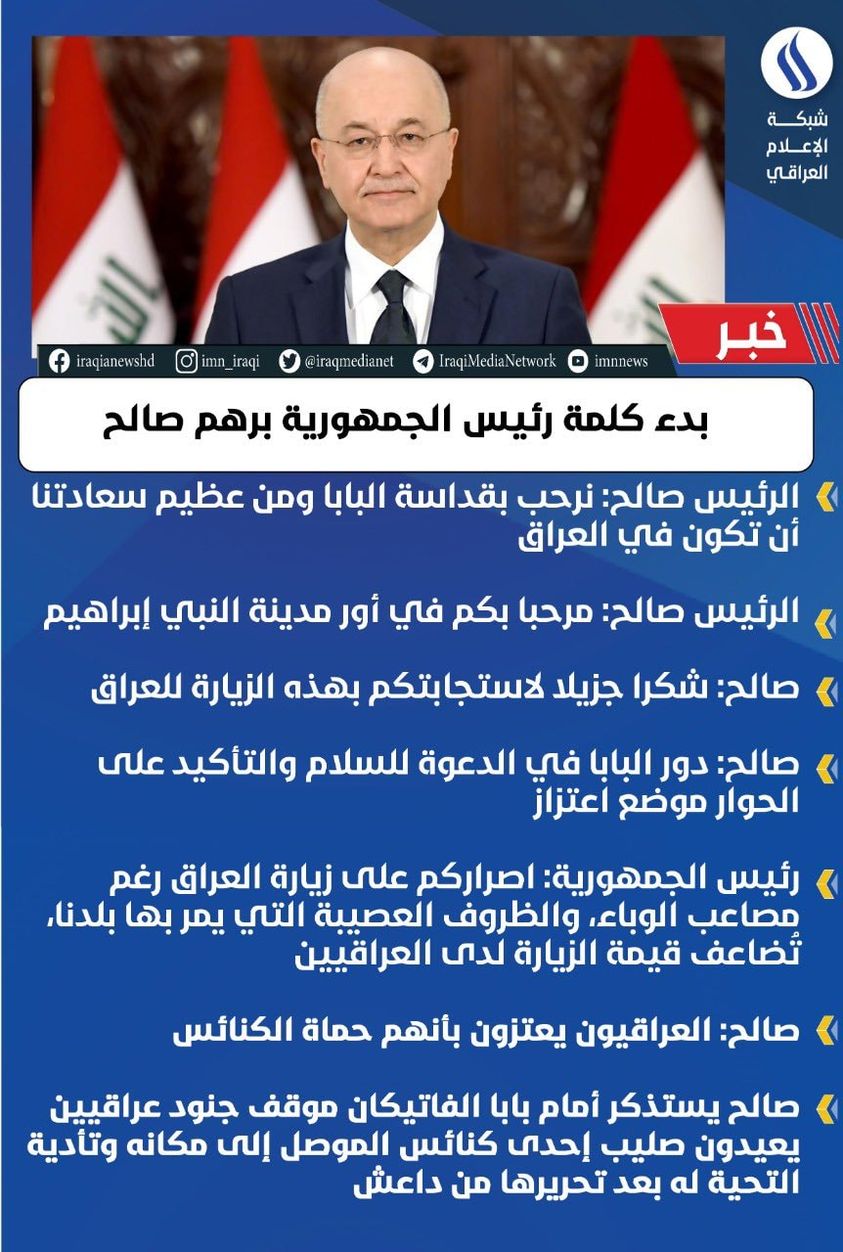وتابع الرئيس العراقي: "دور البابا في الدعوة للسلام والتأكيد على الحوار موضع اعتزاز، العراقيون يفخرون بأنهم عاشوا في مدن متنوعة الانتماء".