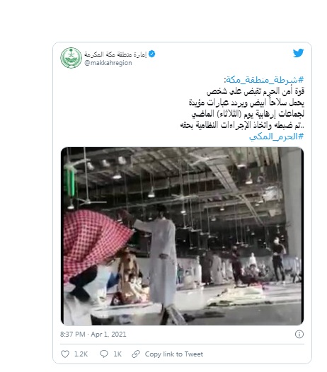 وذكرت الشرطة، على حسابها في تويتر إن "قوة أمن الحرم قبضت على شخص يحمل سلاحا أبيضا ويردد عبارات مؤيدة لجماعات إرهابية".