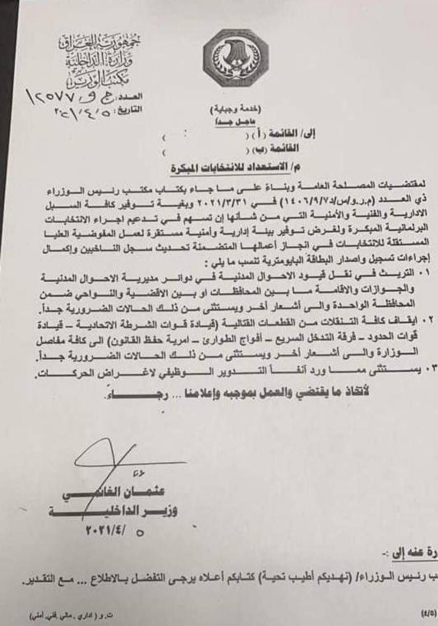 وأظهرت وثيقة اليوم (5 نسان 2021)، أن "وزير الداخلية عثمان الغانمي اصدر 3 توجيهات لتسهيل وتوفير كافة السبل الادارية والفنية والأمنية التي من شأنها أن تسهم في تدعيم اجراء الانتخابات البرلمانية المبكرة كما يأتي: