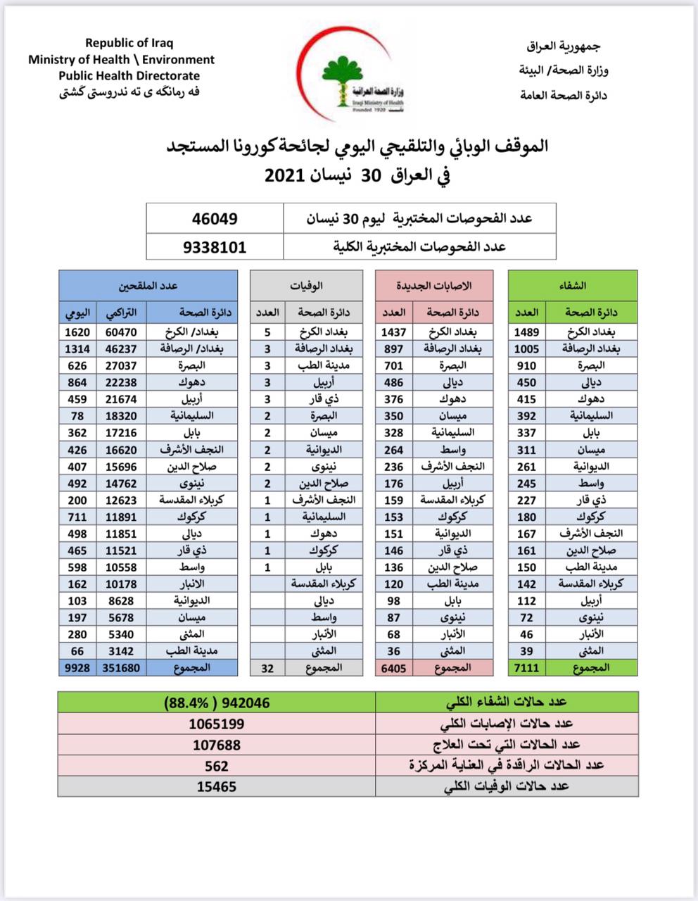 أعلنت وزارة الصحة العراقية، الموقف الوبائي والتلقيحي اليومي لجائحة كورونا في العراق ليوم الجمعة الموافق ٣٠ نيسان ٢٠٢١.