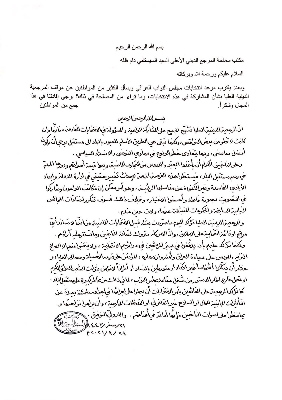 ودعا بيان السيد السيستاني القائمين بأمر الانتخابات أن يعملوا على اجرائها في أجواء مطمئنة بعيدة عن التأثيرات الجانبية للمال او السلاح غير القانوني أو التدخلات الخارجية، وأن يراعوا نزاهتها ويحافظوا على أصوات الناخبين فإنها أمانة في أعناقهم. والله وليّ التوفيق.