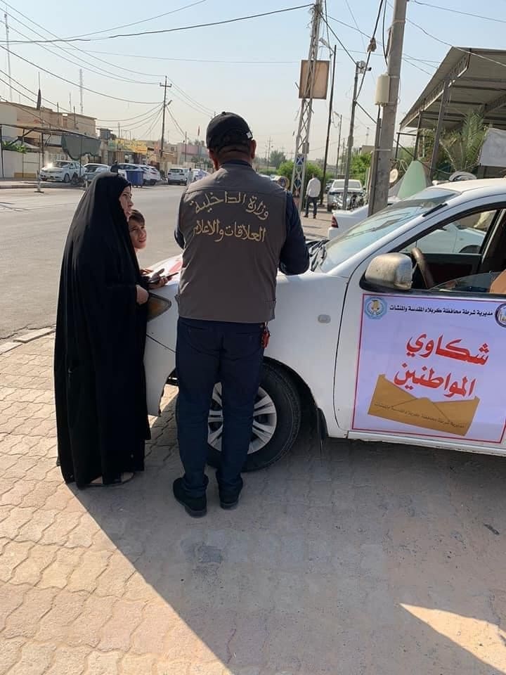 وذكر مدير العلاقات والإعلام في مديرية شرطة كربلاء المقدم المهندس إحسان الأسدي لوكالة نون الخبرية ": أطلقنا مبادرة تعد الأولى من نوعها على مستوى العراق من خلال تخصيص عجلة متنقلة تابعة لشعبة شكاوى المواطنين في قسم العلاقات والإعلام تقوم بتلقي طلبات المواطنين ميدانياً والحضور بين الأهالي في الأحياء والمناطق السكنية لغرض التواصل والاستجابة لهم ،