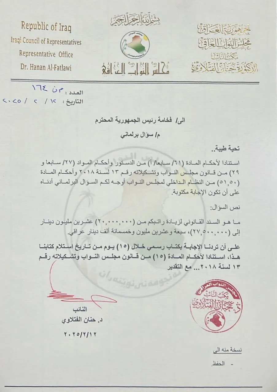 بالوثيقة.. حنان الفتلاوي توجه سؤالاً لرئيس الجمهورية عن زيادة راتبه لـ27 مليون ونصف