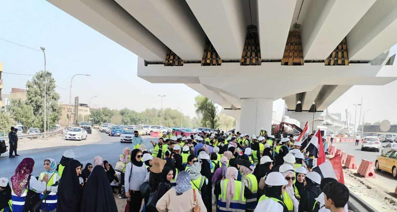 نفذ العشرات من خريجي كليات الهندسة، اليوم الأربعاء، وقفة احتجاجية سلمية قرب الجسر المعلّق المؤدي إلى المنطقة الخضراء ببغداد، للمطالبة بالتعيين ورفع التهميش المستمر بحقهم.