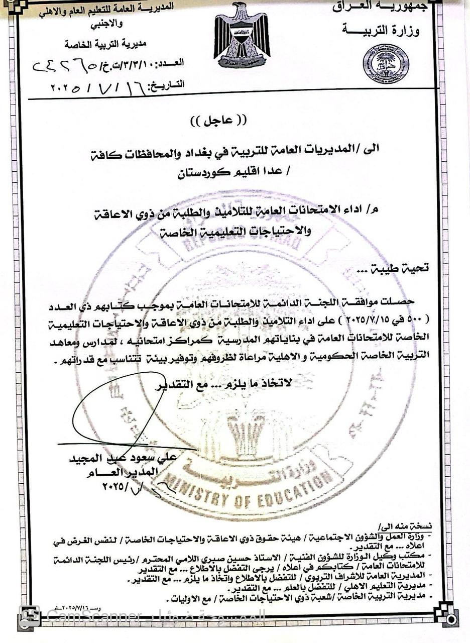وذكر بيان للوزارة، ان "اللجنة الدائمة للامتحانات قررت السماح للتلاميذ والطلبة من ذوي الاحتياجات الخاصة اداء الامتحانات العامة في أبنيتهم المدرسية ذاتها، كمراكز امتحانيه".