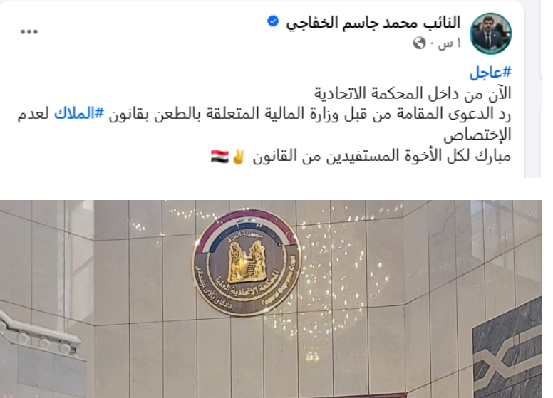 وذكر النائب محمد جاسم الخفاجي في منشور له على الفيسبوك أن”المحكمة الاتحادية ردت الدعوى المقامة من قبل وزارة المالية المتعلقة بالطعن بقانون الملاك لعدم الاختصاص”.