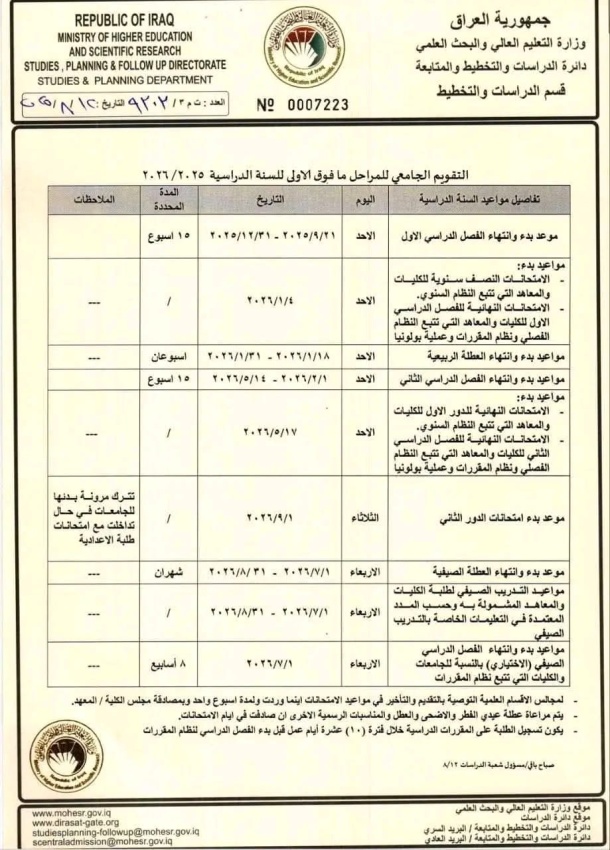أعلنت وزارة التعليم العالي والبحث العلمي، اليوم الإثنين (18 آب 2025)، عن موعد بدء العام الدراسي الجديد لطلبة الجامعات والكليات الحكومية والأهلية للمراحل فوق الأولى، حيث سيبدأ الدوام الرسمي بتاريخ 21 أيلول 2025.