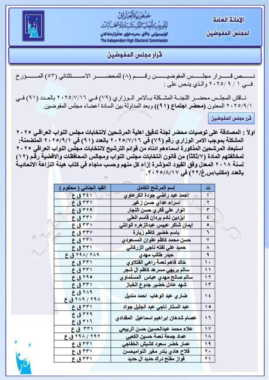 ووفقاً للقوائم، فإن المفوضية قررت استبعاد 53 مرشحاً جديداً على خلفية عدم توافر حسن السيرة والسلوك، كما منصوص عليها قانون الانتخابات الساري، فضلاً عن شمولهم بهيئة المساءلة والعدالة.