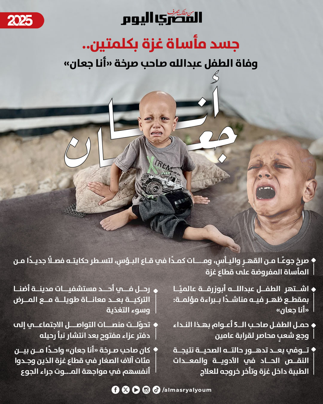 جسد مأساة غزة بكلمتين.. وفاة الطفل عبد الله صاحب صرخة «أنا جعان» السبت 06 ايلول 2025 سياسية 641 مشاهدة جسد مأساة غزة بكلمتين.. وفاة الطفل عبد الله صاحب صرخة «أنا جعان» وفاة الطفل عبد الله صاحب صرخة «أنا جعان» في احد المستشفيات التركية التعليقات (0) لا توجد تعليقات بعد. كن أول من يعلق! اسمك البريد الإلكتروني تعليق إرسال التعليق