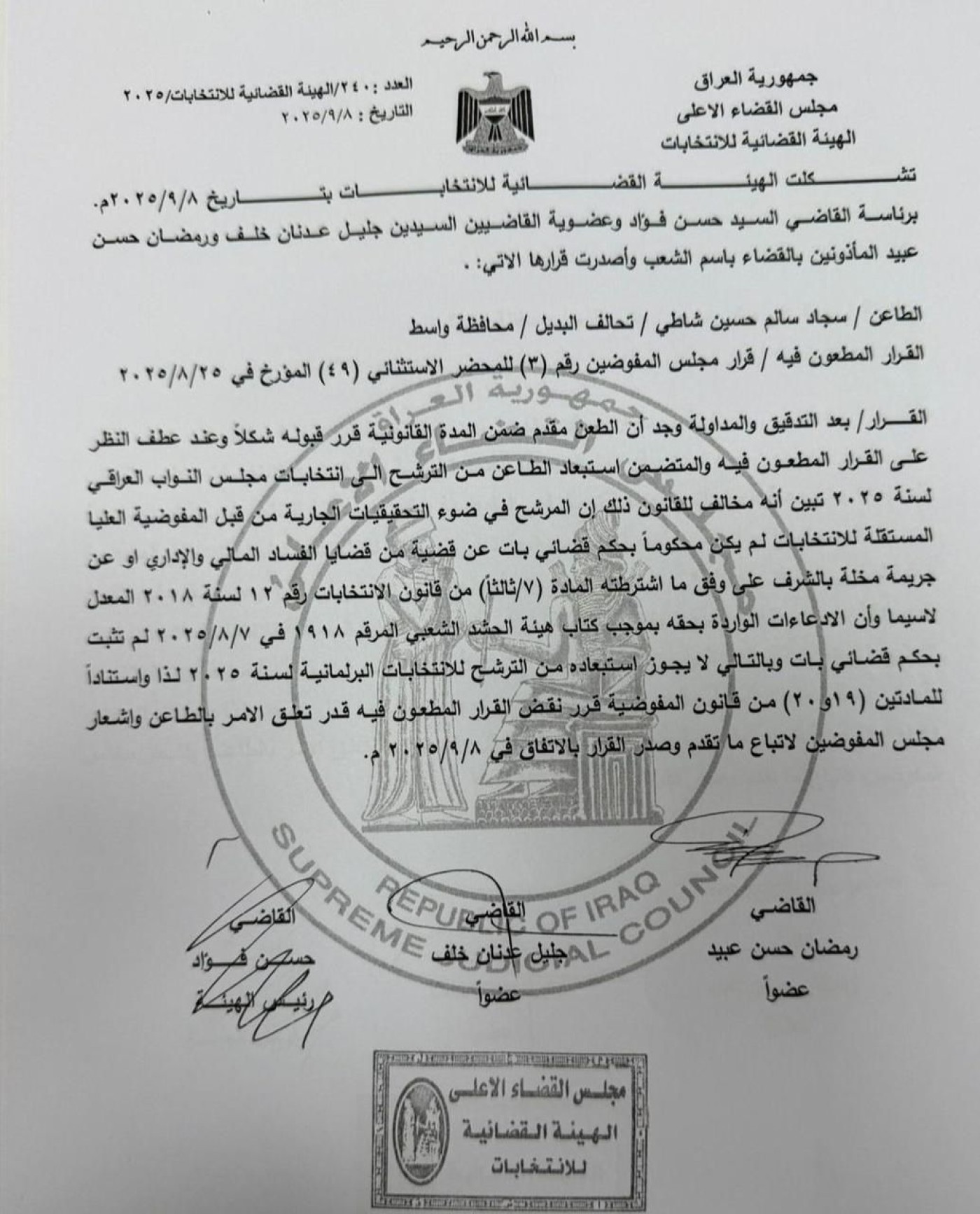 وأضافت الوثيقة، أن "الادعاءات الواردة بحقه بموجب كتاب هيئة الحشد الشعبي لم تثبت بحكم قضائي بات، وبالتالي لا يجوز استبعاده من الترشح للانتخابات النيابية، ولهذا تقرر نقض القرار".