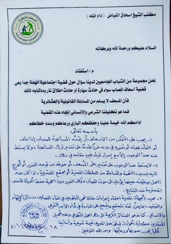 أجاب مكتب المرجع الديني الشيخ محمد إسحاق الفياض، على سؤال حول إسعاف المصابين حتى مع وجود احتمالية للمساءلة القانونية.