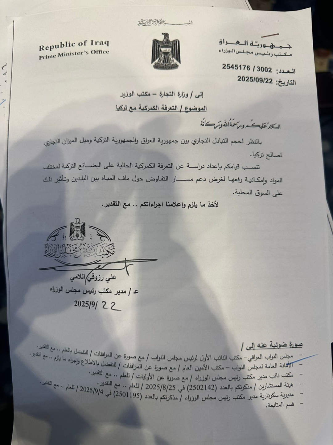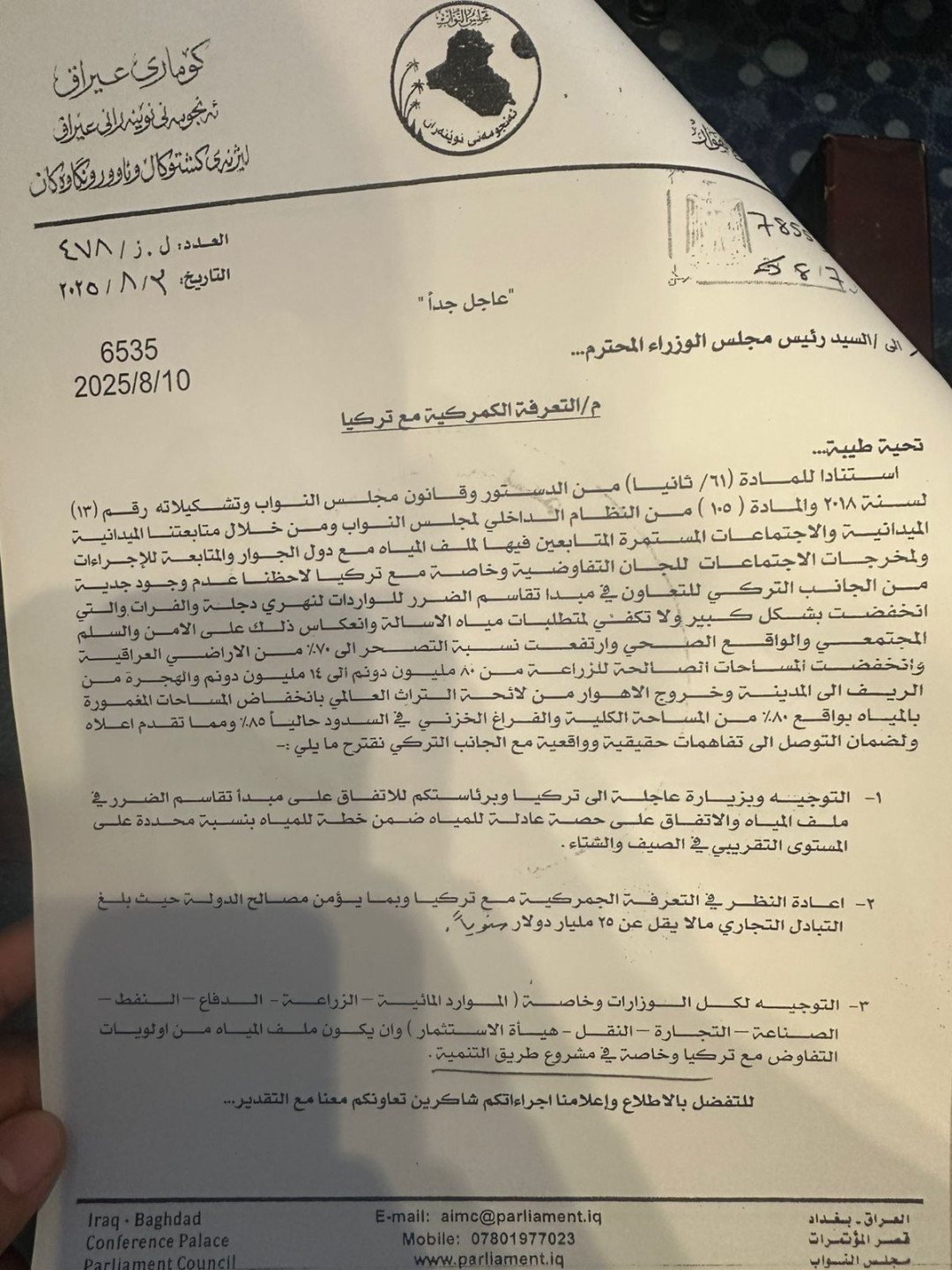 قدّم رئيس لجنة الزراعة والمياه النيابية فالح الخزعلي، طلباً إلى الحكومة العراقية لإعادة النظر بالتعرفة الكمركية مع تركيا للضغط على حكومة أنقرة في ملف المياه.