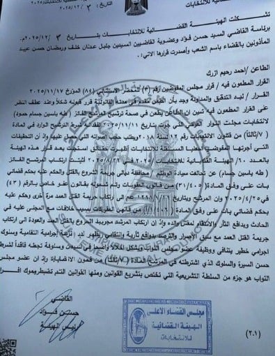 أصدرت الهيئة القضائية للانتخابات، قراراً بإلغاء فوز المرشح عن حزب السيادة طه ياسين جسام حمود المجمعي وحجب أصواته الانتخابية.