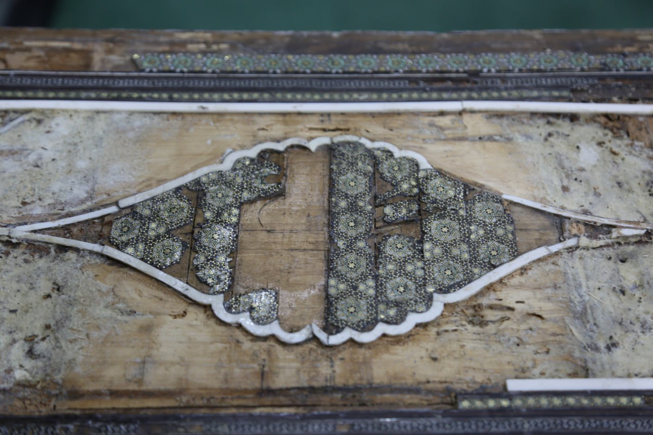 وقال مسؤول شعبة الصيانة والترميم داخل حرم الامام الحسين (عليه السلام) "حسنين رحمن عبد الله" في تصريح لوكالة نون الخبرية ان "العمل بدأ بجمع المقتنيات التي تخص متحف الامام الحسين (عليه السلام) في بداية تأسيسه في العام (2009)، وعثرنا على قطع خشبية في مواقع عدة لم نعرف حينها الى اي شيء تعود وكانت توقعاتنا انها تعود الى الصندوق الخشبي للقبر الشريف كونها تمتاز بفن يسمى "فن الخاتم" وقد سمي بهذا الاسم كونه خاتم لجميع الفنون، الذي يدخل بصناعته حوالي (7) انواع من الاخشاب بالوان طبيعية، كما يدخل بصناعته معادن الفضة والذهب من القطع الثمينة"، مستدركا بالقول "لكن الآن ومع الحداثة التي طرأت استبدلت هذه القطع بالألمنيوم وغيرها من المعادن، وبعد ان جمعنا جميع القطع الخشبية في العام (2011)، وجدنا انها عبارة عن منبر خطابة يعود تاريخه الى حوالي (185) عاما ميلاديا، واهدي الى مرقد الامام الحسين (عليه السلام) من قبل رئيس وزراء الدولة القاجارية "الميرزا ابو الحسن خان" حيث كتب اسمه اعلى المنبر، وقد بحثنا عن هذا الاسم ووجدنا انه بالفعل رئيس الوزراء حينها، ومن المؤسف اننا عندما بدأنا بترميم هذه القطع وجدناها تضررت بشكل كبير نتيجة الرطوبة وغيرها، بسبب الخزن غير الصحيح لعدم معرفة من خزنها بقيمتها"، مشيرا بالقول" لكننا بعد ان انتظمنا في دورات تدريبية عالية المستوى في المتحف العراقي، تمكنا من تقليل الضرر الحاصل الى ادنى حد باستخدام المادة اللاصقة "الغراء".