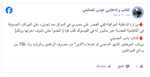 قال موقع القاهرة 24 المصري نقلا عن تقارير إعلامية بأن الأجهزة الأمنية العراقية أوقفت مواطنا مصريا على خلفية منشور نشره عبر حسابه على موقع "فيسبوك".يتجاوز فيه على الشعائر الحسينية