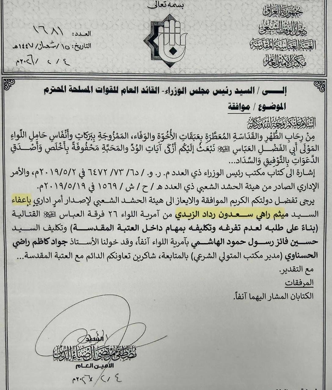 على صعيد متصل، أظهرت وثيقة رسمية صدور موافقة على إعفاء قائد فرقة العباس القتالية اللواء ميثم راهي سعدون رداد الزيدي من منصبه، وذلك بناءً على طلبه الشخصي.
