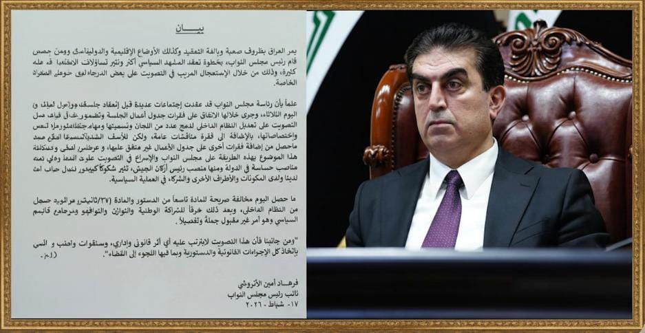 أصدر نائب رئيس مجلس النواب العراقي، فرهاد الأتروشي، بياناً رسمياً اليوم الثلاثاء، انتقد فيه بشدة الإجراءات الأخيرة لرئيس مجلس النواب، واصفاً إياها بالخطوة التي تزيد المشهد السياسي تعقيداً وتثير تساؤلات كثيرة في ظل الظروف الصعبة التي يمر بها العراق والمنطقة.