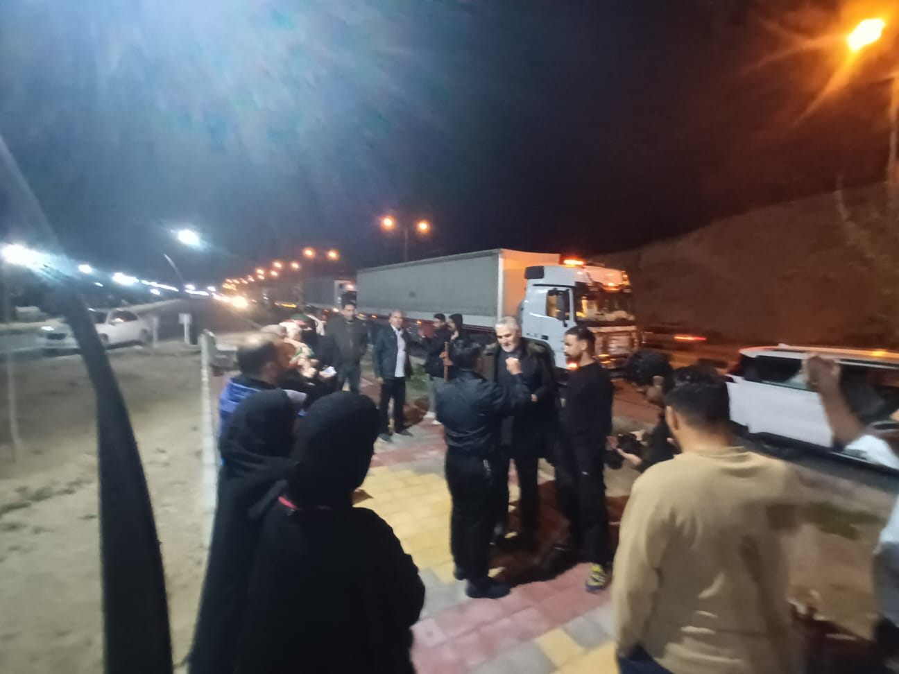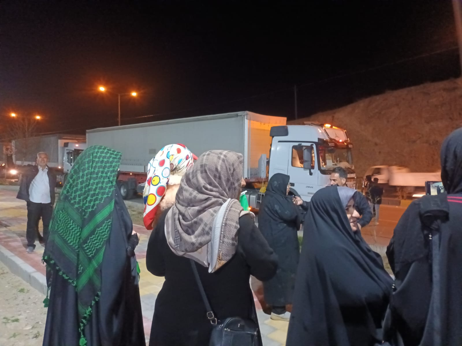 دون تخطيط او موعد معد مسبقا توقفت قافلة المساعدات الاغاثية الانسانية على الشارع العام في مدينة نهاوند الايرانية عند الساعة العاشرة ليلا لامر يتعلق بتنظيم حركة القافلة، وهي المدينة التي تعتبر مسقط رأس زوجة الامام الحسين وام الامام السجاد (عليهما السلام) السيدة "شاه زنان"، وكذلك مسقط رأس المقاتل "كيان الفارسي" الذي استشهد مع المختار، وكان جانب من الشارع تطل عليه بيوت اهالي المدينة والجانب الآخر احد جبالها، وهيبة القافلة تلفت الانظار بعدد شاحناتها وسيارتها، ففتحت نوافذ البيوت اولا، ثم فتحت الابواب وخرجت عائلات تنظر من بعيد وتقدم الناس نحو القافلة وتوقفت عدد من السيارات التي تحمل عائلات ايرانية قرب القافلة وكانوا يتقدمون بحياء وتوجس من السؤال، وما ان عرفوا انها قافلة العتبة الحسينية المقدسة لمساعدة الشعب الايراني حتى تجمعوا بسرعة وعبر الاتصالات الهاتفية زاد العدد وارتفع النحيب والبكاء، واكثر ما اثار شجونهم وحزنهم وانفعالاتهم هو تقديم اعضاء القافلة للتربة الحسينية والراية السوداء لهم ما جعلهم يجهشون ببكاء شديد ويقدمون الشكر للمرجعية الدينية العليا والعتبة الحسينية والشعب العراقي.