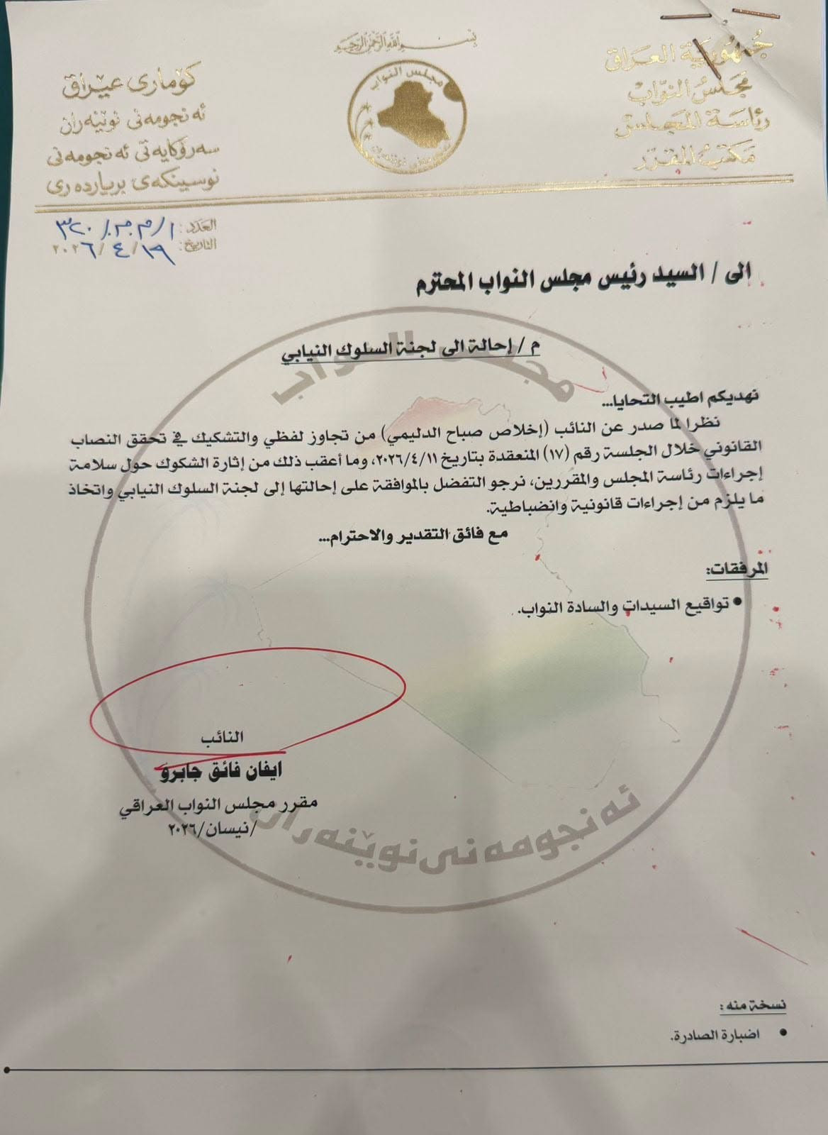 أحالت رئاسة مجلس النواب، اليوم الأحد، النائبة إخلاص الدليمي إلى لجنة السلوك النيابي.