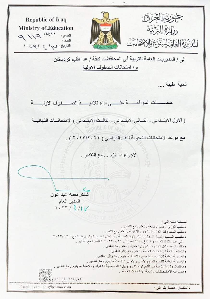 وقالت الوزارة في بيان صحافي تلقت وكالة نون الخبرية نسخة منه ان " المديرية العامة للتقويم والامتحانات وزارة التربية أصدرت قراراً بالسماح لتلاميذ الصفوف الدراسية الأولية ( الأول والثاني والثالث الابتدائي) من أداء الامتحانات النهائية بالتزامن مع موعد الإمتحانات الشفوية للعام الدراسي الحالي ( 2022 ـ 2023).