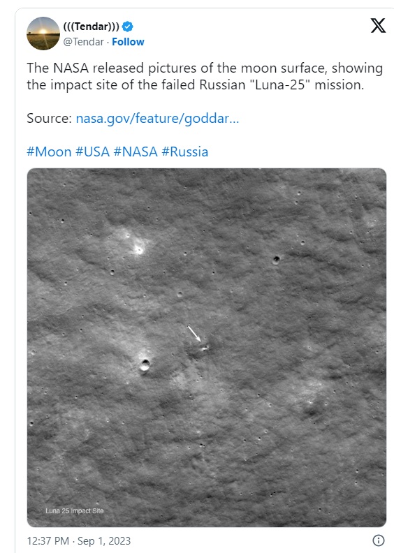 أظهرت لقطات وصور نشرتها إدارة الطيران والفضاء الأميركية "ناسا" أن مركبة الفضاء الروسية "لونا-25"، التي فشلت في الهبوط على القطب الجنوبي للقمر خلفت حفرة إتساعها 10 أمتار عندما تحطمت الشهر الماضي بسبب مشكلة فنية.