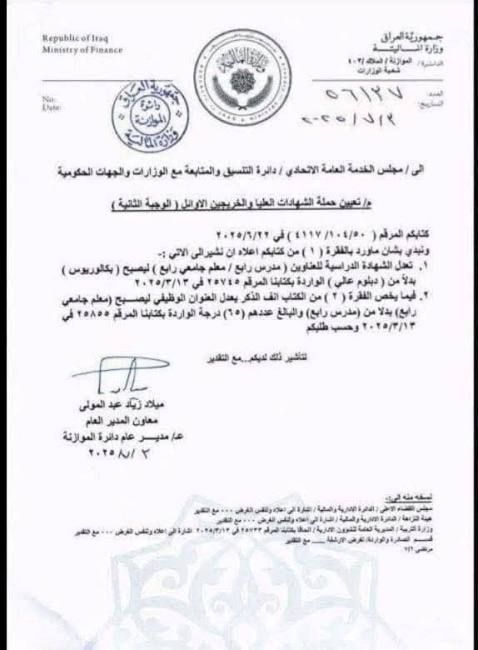 المالية توافق على تعديل وتصحيح العناوين الوظيفية الأثنين 07 تموز 2025 إقتصادية 1,310 مشاهدة المالية توافق على تعديل وتصحيح العناوين الوظيفية كشفت وزارة المالية موافقتها على كتاب ( منسوب ) لمجلس الخدمة الاتحادي بخصوص تعديل وتصحيح العناوين الوظيفية للمعينين على وزارة التربية من حملة شهادتي الدبلوم العالي والبكالوريوس. كلمات مفتاحية التربية وزارة التربية وزارة المالية الدبلوم العالي مجلس الخدمة الاتحادي البكالوريوس الاتحاد العناوين الوظيفية التعليقات (0) لا توجد تعليقات بعد. كن أول من يعلق! اسمك البريد الإلكتروني تعليق إرسال التعليق تعليقاتكم والموضوعات الأكثر تداولاً أكثر المواضيع قراءة عرض الكل الأكثر قراءة اليوم الأسبوع الشهر سنة 1 مقالات حذارِ من الترميز بحرف الـ ( ص) أو (ع) للمعصومين صلوات الله عليهم 1129 مشاهدة --منذ 7 ساعة 2 سياسية الوضع المالي حرج جداً.. السوداني يصارح الإطار والمالكي يرد: أحسنت ولذلك يجب تغييرك 764 مشاهدة --منذ 19 ساعة 3 إقتصادية في ظروف جوية صعبة بلبنان:العتبة الحسينية توزع خامس وجبة من المساعدات على النازحين السوريين غربي بعلبك 610 مشاهدة --منذ 24 ساعة 4 علمية طعام يومي يحمي العظام ويقويها أكثر من الحليب 477 مشاهدة --منذ 9 ساعة 5 أمن ومجتمع الطقس يعطل الدوام الرسمي في محافظة عراقية 418 مشاهدة --منذ 21 ساعة 1 إقتصادية أسعار صرف الدولار مع افتتاح الأسواق في العراق صباح الاثنين 2299 مشاهدة --الأثنين 15 كانون الأول 2025 2 اخبار محلية كربلاء تنتقد قرارات لوزارة الداخلية وتصفها بانها عملية قتل مع "سبق الاصرار" للسياحة بالعراق والمحافظة 2257 مشاهدة --الأثنين 15 كانون الأول 2025 3 إقتصادية تعرف على أسعار صرف الدولار مع اغلاق البورصة مساء الأحد 2160 مشاهدة --الأحد 14 كانون الأول 2025 4 إقتصادية الدولار يواصل ارتفاعه أمام الدينار العراقي مساء السبت 2090 مشاهدة --السبت 13 كانون الأول 2025 1 سياسية مجلس بغداد يُفعّل نظام التوصيل المنزلي للنفط الأبيض 4526 مشاهدة --الخميس 20 تشرين الثاني 2025 2 إقتصادية الدولار يواصل ارتفاعه أمام الدينار العراقي 3439 مشاهدة --الأربعاء 19 تشرين الثاني 2025 3 إقتصادية الدولار يواصل ارتفاعه أمام الدينار العراقي 3289 مشاهدة --الثلاثاء 25 تشرين الثاني 2025 4 سياسية دولة القانون تكشف عن مرشح جديد لرئاسة الوزراء 2887 مشاهدة --الأثنين 24 تشرين الثاني 2025 5 إقتصادية أسعار صرف الدولار مع إغلاق السوق مساء الأربعاء في العراق 2832 مشاهدة --الأربعاء 03 كانون الأول 2025 6 اخبار محلية كربلاء توزع حصة النفط الأبيض بالبطاقة الالكترونية رقم (٢) 2793 مشاهدة --الثلاثاء 18 تشرين الثاني 2025 1 اخبار محلية خلال زيارته لمشروع صحن العقيلة.. ممثل السيد السيستاني يوعز بتخصيص مساحة (5) الاف متر على اسطح البنايات للزائرين 18736 مشاهدة --السبت 13 ايلول 2025 2 سياسية مكتب السيد السيستاني ينشر إمساكيات شهر رمضان المبارك للمحافظات العراقية لعام 1446هـ (2025م) 14034 مشاهدة --الأربعاء 19 شباط 2025 3 لقاءات *محمد الصواف: عدسة توثق الحقيقة وتنقل قصص الإنسانية في قلب الأزمات* 12646 مشاهدة --الأحد 30 آذار 2025 4 لقاءات منها الخاصة وفوق الكبرى والكبرى.. حيدر زيني.. طبيب أجرى (51) عملية في (28) ساعة متواصلة بمستشفى السفير 11272 مشاهدة --الثلاثاء 27 آيار 2025 5 اخبار محلية كربلاء تحدد تسعيرة "أمبير" المولدات الأهلية لشهر حزيران 2025 9845 مشاهدة --الثلاثاء 27 آيار 2025 6 تحقيقات بينَ زَخَّاتِ الرَّصاصِ وَدُموعِ الأهلِ.. قِصةُ شهيدٍ كَتبَتْ كربلاءُ خاتِمَتَهُ 9264 مشاهدة --الأربعاء 02 نيسان 2025 آخر التعليقات 1 طالب عبدالله حسين التعليق : اريد هذا الكتاب كامل ... الموضوع : قراءة في كتاب تاريخ الشطرة خلال العهد العثماني دراسة.د . شاكر الشطري 2 قيس الشاهين التعليق : وفق الله الجميع لما فيه خير وصلاح هذه الامة وجزى الله المنقذموظف الغابة العباسبة المقدسة ... الموضوع : منتسب بالعتبة العباسية ينقذ طفلا تائها في منطقة صحراوية بمحافظة ميسان 3 Alshereffy Najim التعليق : أنا من اشد المعجبين في هذا الرافد. 