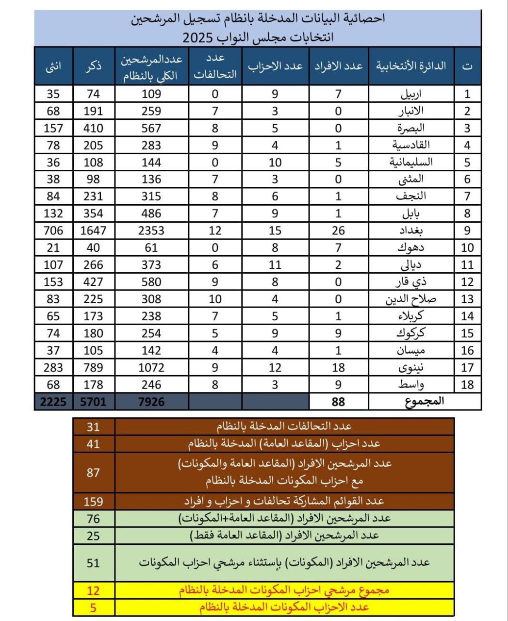 وأظهرت الوثيقة الرسمية، تنشرها أدناه وكالة نون الخبرية، أن إجمالي عدد المرشحين المسجلين لخوض انتخابات مجلس النواب العراقي بلغ 7926 مرشح، من بينهم 5701 من الذكور و2225 من الإناث.
