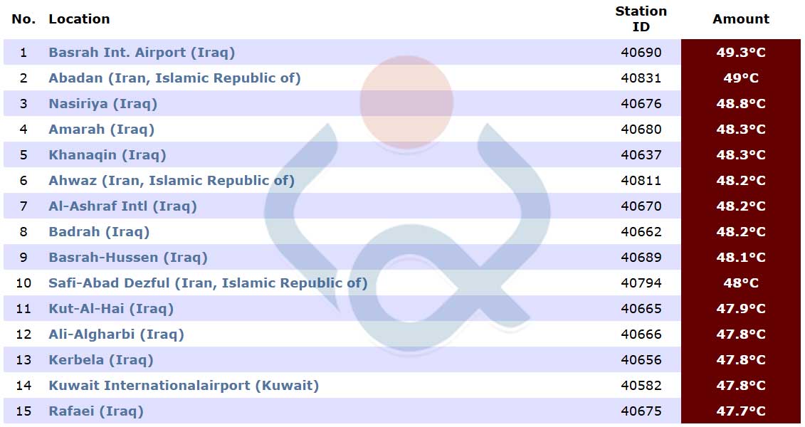 وبين الجدول أن منطقة مطار "البصرة الدولي" في العراق سجلت أعلى درجة حرارة بالعالم، وبواقع 49.3 درجة مئوية، تليها بالمرتبة الثانية "عبادان" في إيران وبواقع 49 درجة مئوية، تليها بالمرتبة الثالثة مدينة "الناصرية" في العراق وبواقع 48.8 درجة مئوية، ومن ثم جاءت " العمارة" في العراق رابعاً وبواقع 48.3 درجة مئوية، وجاءت "خانقين" في العراق خامساً بدرجة حرارة بلغت 48.3 درجة مئوية.