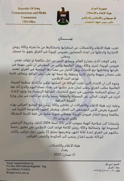 علقت هيئة الإعلام والاتصالات العراقية عمل وكالة "رويتر" في البلاد لمدة 3 أشهر، وطالبتها بالاعتذار على خلفية نشرها تقريراً "يهدد الأمن المجتمعي" يفيد أن أعداد الإصابات بفيروس كورونا في العراق أكثر من تلك التي تعلنها وزارة الصحة.