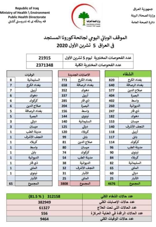 تنشر وكالة نون الخبرية الموقف الوبائي اليومي لجائحة فيروس كورونا بحسب ما أعلنته وزارة الصحة والبيئة اليوم الإثنين 5 تشرين الأول 2020.حيث بينت الوزارة ان حالات الشفاء بلغت اليوم الاثنين اكثر من 4600 بينما بلغت حالات الاصابة بكورونا اكثر من 3800 فيما سجلت الوزارة 65 حالة وفاة