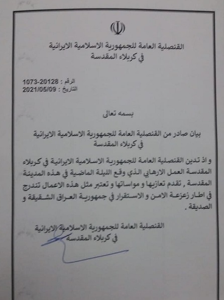 ونقل بيان للقنصلية الايرانية في كربلاء المقدسة حصلت وكالة نون الخبرية على نسخته اليوم ان القنصلية تدين العمل الارهابي الذي وقع الليلة الماضية في المدينة المقدسة وتقدم تعازيها ومواساتها وتعتبر ان هذه الاعمال تندرج في اطار زعزعة الامن والاستقرار في جمهورية العراق الشقيقه والصديقة