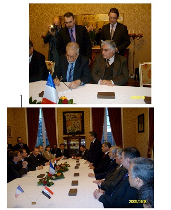 (صورتين لتوقيع العقد واللجنة في فرنسا يظهر فيها وزير الاتصالات الأسبق المرحوم فاروق عبد القادر ووزير العلوم والتكنولوجيا الدكتور رائد فهمي ووزير الامن الوطني السيد شيروان الوائلي)