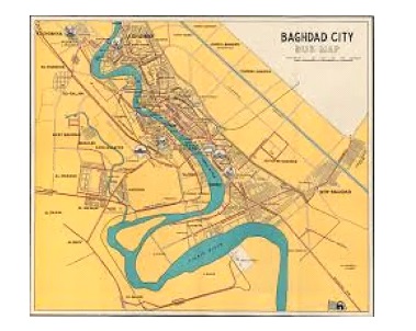 (خارطة بغداد وتبين منطقة الكرادة محاطة بنهر دجلة من ثلاث جهات)