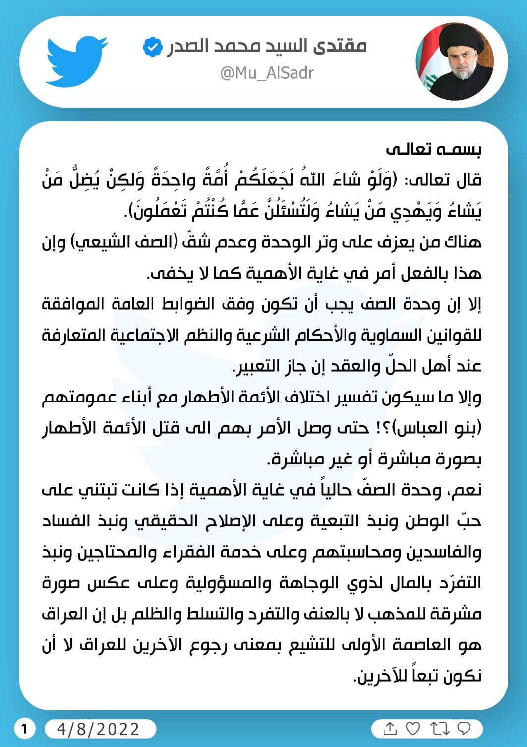 وقال الصدر في تغريدة على موقع تويتر ؛ إن "هناك من يعزف على وتر الوحدة وعدم شق (الصف الشيعي) وإن هذا بالفعل أمر في غاية الأهمية كما لا يخفى أن وحدة الصف يجب أن تكون وفق الضوابط العامة الموافقة للقوانين السماوية والأحكام الشرعية والنظم الاجتماعية المتعارفة عند أهل الحل والعقد، إن جاز التعبير، وإلا ما سيكون تفسير اختلاف الأئمة الأطهار مع أبناء عمومتهم ( بنو العباس) حتى وصل الأمر بهم الى قتل الأئمة الأطهار بصورة مباشرة أو غير مباشرة".