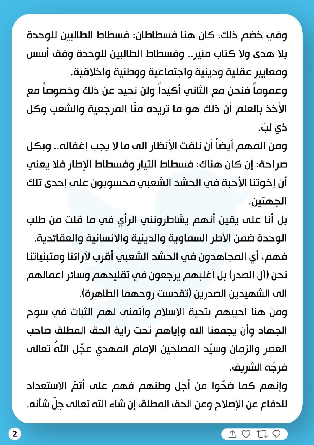 وبيّن الصدر في تغريدته أن "من المهم أيضاً أن نلفت الأنظار الى ما لا يجب إغفاله.. وبكل صراحة : أن كان هناك : فسطاط التيار وفسطاط الإطار فلا يعني أن إخوتنا الأحبة في الحشد الشعبي محسوبون على إحدى تلك الجهتين، بل أنا على يقين انهم يشاطرونني الرأي في ما قلت من طلب الوحدة ضمن الأطر السماوية والدينية والإنسانية العقائدية".