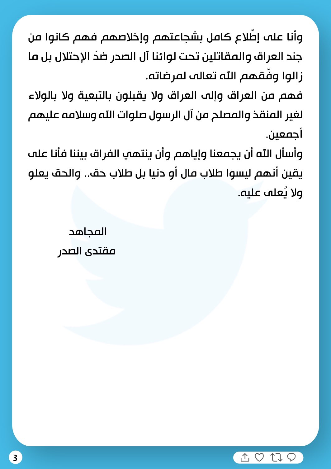 وأوضح الصدر في تغريدته "انا على اطلاع كامل بشجاعتهم واخلاصهم فهم كانوا من جند العراق والمقاتلين تحت لوائنا آل الصدر ضد الاحتلال بل مازالوا، فهم من العراق والى العراق ولا يقبلون بالتبعية ولا بالولاء لغير المنقذ والمصلح من آل الرسول صلوات الله وسلامه عليهم اجمعين".