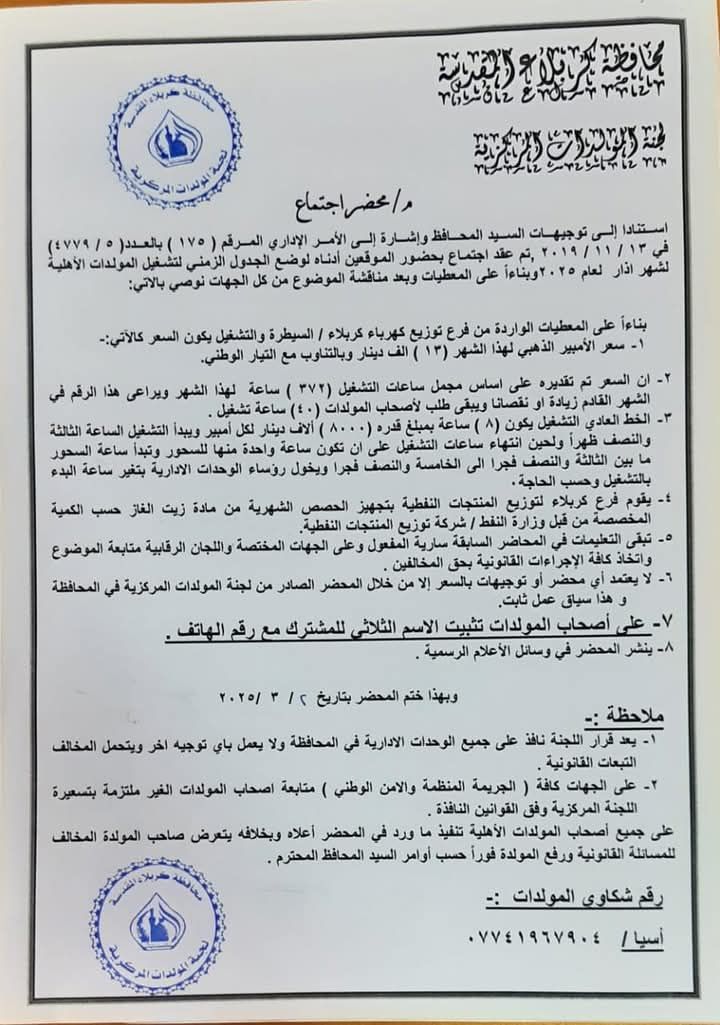 كربلاء تحدد تسعيرة المولدات الاهلية لشهر رمضان الجاري (اذار)