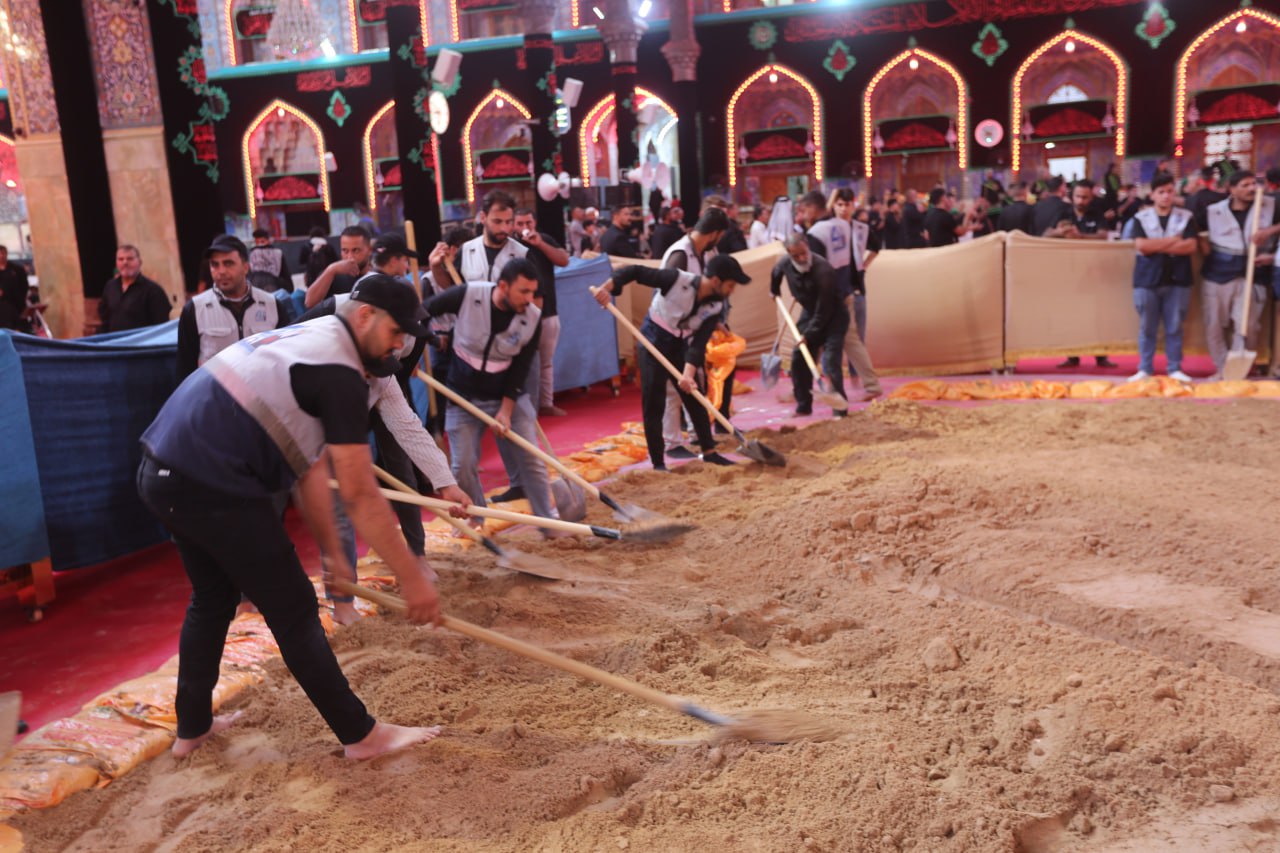لا يعملون كخلية النحل بل هم خلية النحل انفسهم بدأوا قبل ان يحل شهر الحزن محرم الحرام وما زالوا مستمرين بالعمل وسيستمرون الى ما بعد انتهاء الزيارة الاربعينية انهم ملاكات قسم الصيانة في العتبة الحسينية المقدسة الذين اكملوا فرش سبعة ابواب في الحرم المقدس بالتراب ومادة جديدة لها مواصفات خاصة لتلك المناسبات، وتصدوا لتوزيع الاف القوالب من الثلج واطنان المكعبات الثلجية ووفروا التظليل للزائرين والماء الصالح للشرب واعمال اخرى كثيرة.