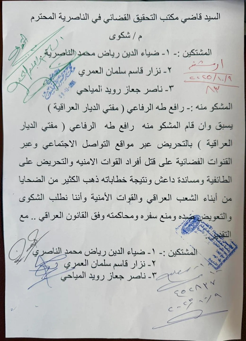 وقال الناصري في بيان تلقته وكالة نون: "نحن المتضررون من التحريض الذي قام به مفتي الديار العراقية المدعو رافع طه الرفاعي، وقد قدمنا شكوى قضائية وأصولية لدى محكمة استئناف ذي قار – الناصرية، نتيجة الضرر الذي تسببت به خطاباته التحريضية والطائفية وتضليله للرأي العام، مما أسفر عن عشرات الآلاف من الضحايا بين شهداء وجرحى ومشرّدين وسبايا".
