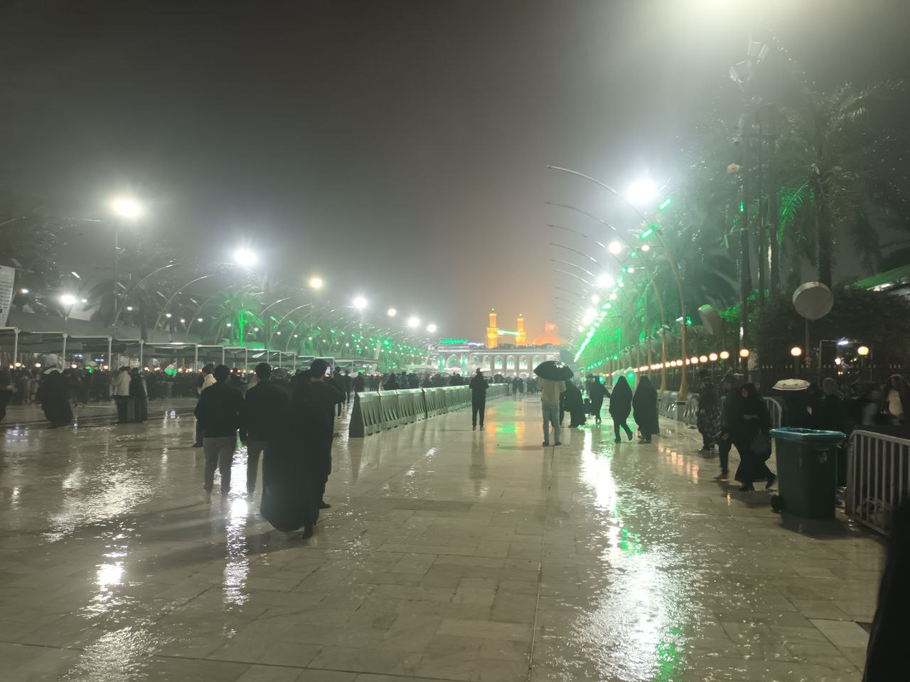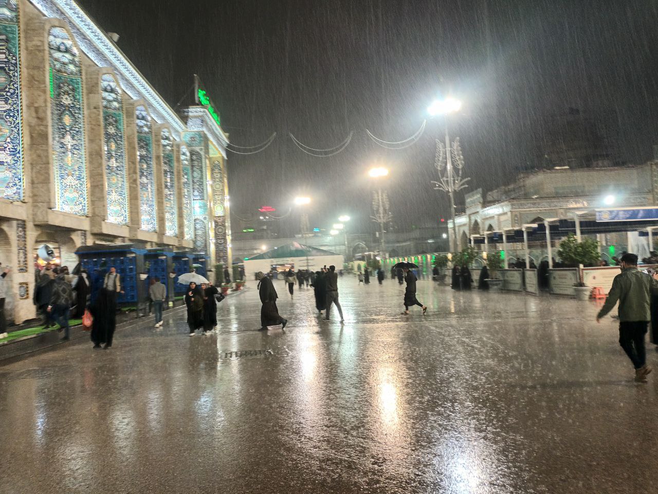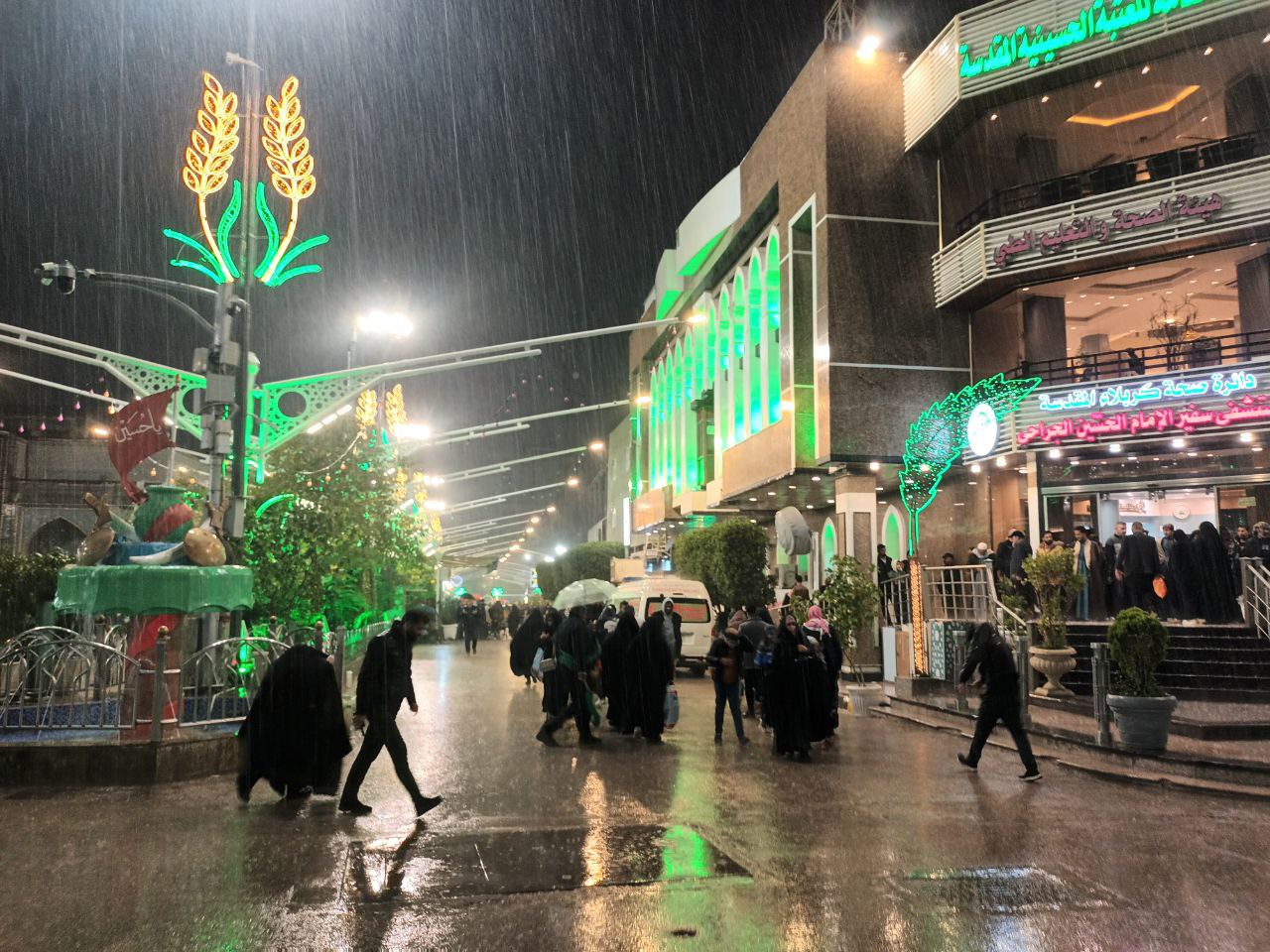وفي هذه الليلة قد وصلنا الى اليوم التاسع والعشرين من الشهر الفضيل توافق ليلة الجمعة ورغم الاجواء المتقلبة والرياح والامطار الا ان الملايين من الزائرين أصروا على الحضور الى مدينة كربلاء الحسين وقضاء آخر ليلة من ليالي الشهر الفضيل في العام الهجري الجاري (1447) في رحاب سيد الشهداء واخية ابي الفضل العباس (عليهما السلام)، حيث اتخذوا طرقا مختلفة لاتقاء زخات المطر التي كانت قبل صلاة المغرب رذاذا خفيفا ثم اشتدت بعد الساعة الثامنة ليلا، فمنهم من وقف تحت المسقفات بين الحرمين، وآخرين في أواوين الحرمين، وغيرهم وضعوا جزء من ملابسهم على رؤوسهم مثل العباءة العربية او القمصلة، والكثير رفع المظلات (الشمسيات)، ورفعت اعداد غفيرة منهم اكفها بين الحرمين تدعوا الله بقضاء الحوائج، لانها ليلة تزاحمت بها حركة الامطار مع خطوات الزوار عند السبط الشهيد ابو الاحرار.