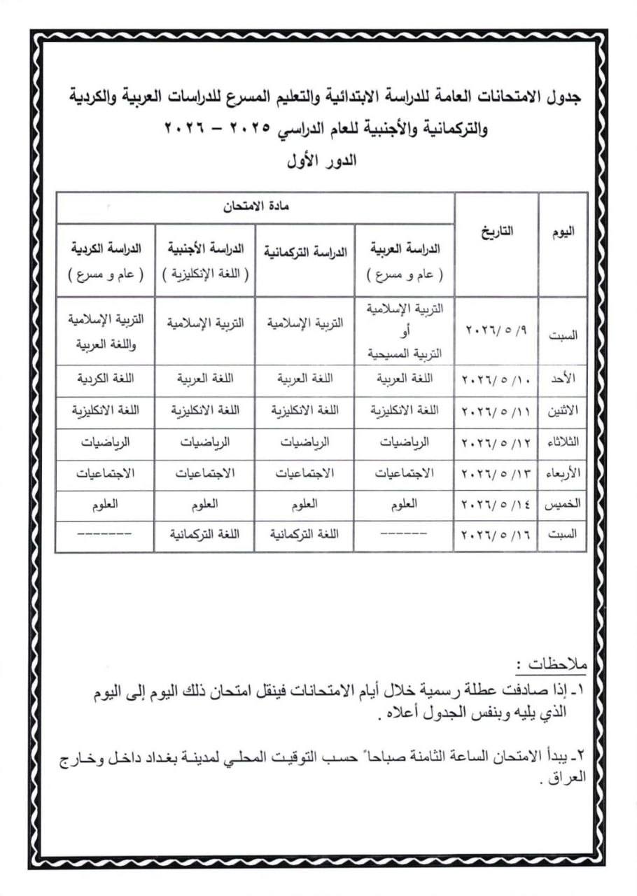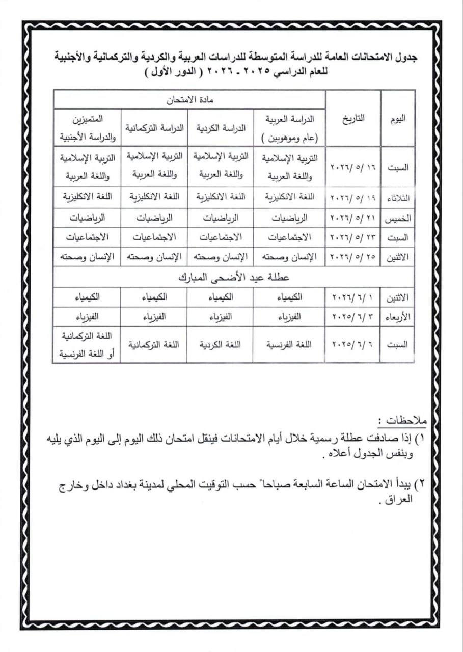 أعلنت وزارة التربية، اليوم الثلاثاء، جداول الامتحانات العامة للدراسة الابتدائية والمتوسطة للعام الدراسي (2025-2026) / الدور الأول.