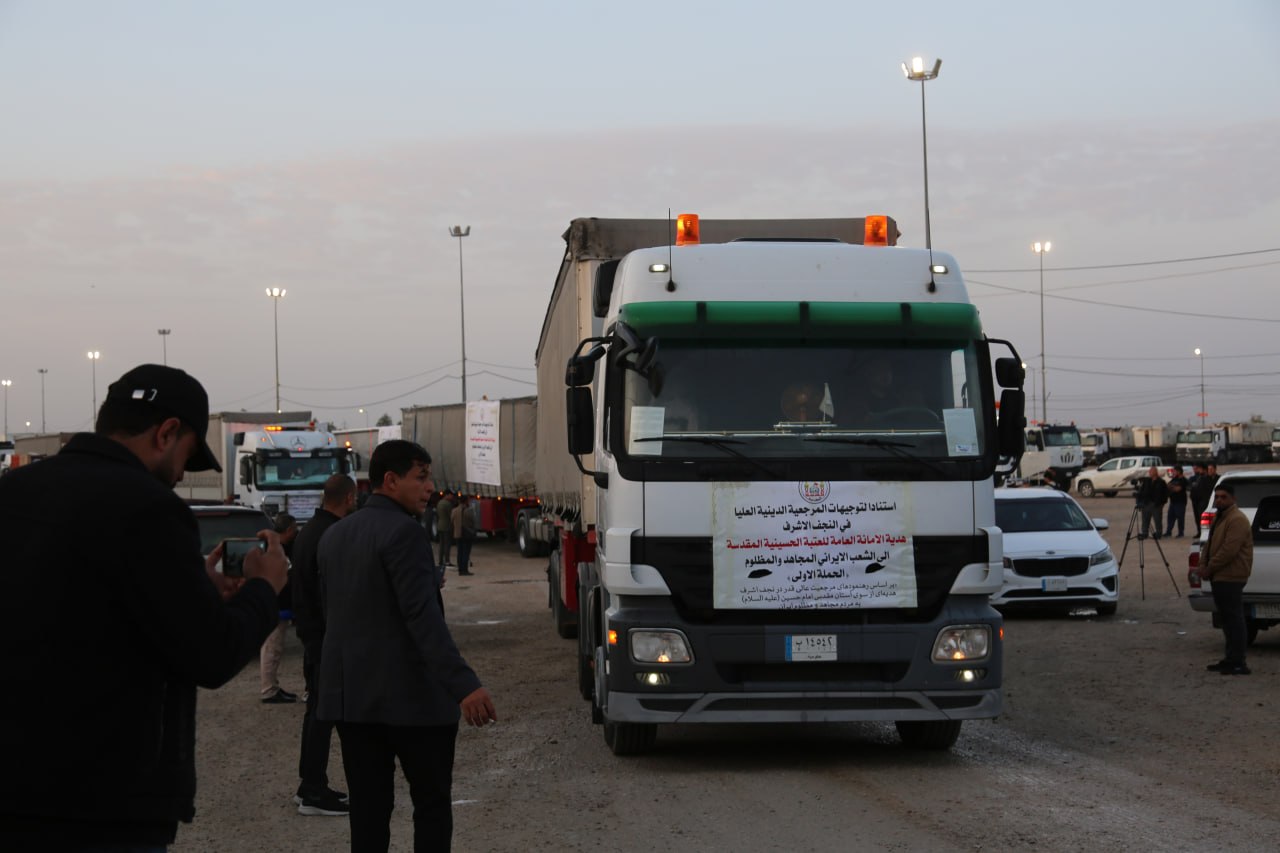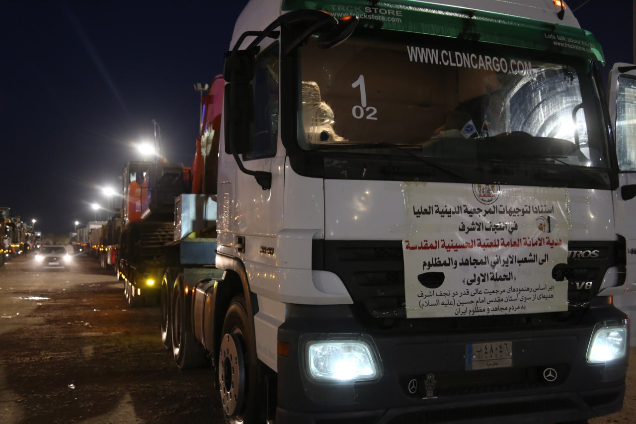 واكد عضو لجنة الاغاثة والمدير الاداري لمستشفى سفير الامام الحسين (عليه السلام) الجراحي المهندس "عباس عبد علي" في تصريح خص به وكالة نون الخبرية ان" نداءً مباركا صدر من المرجع الديني الاعلى السيد "علي السيستاني"، صدر بموجبه توجيها مهما من المتولي الشرعي للعتبة الحسينية المقدسة الشيخ "عبد المهدي الكربلائي"، اكملت بموجبه مهام تجهيز القافلة الاولى الخاصة باغاثة الشعب الايراني المظلوم، حيث تضمنت الحملة الاولى توفير الاجهزة الطبية التخصصية النوعية، وكذلك وفرت عجلات الاسعاف والخدمات الانسانية، وجهزت شاحنات محملة بمواد انسانية وضرورية يحتاجها الشعب الايراني، وحاجات هم بأمس الحاجة لها واخرى مسعفة جدا بناء على كتاب ورد من القنصلية الايرانية في كربلاء المقدسة يطلب من العتبة الحسينية المقدسة توفيرها وكانت الاستجابة سريعة جدا من المتولي الشرعي للعتبة الحسينية المقدسة الشيخ "عبد المهدي الكربلائي"، وانطلقت اليوم نحو المنافذ الحدودية الرابطة بين العراق وايران لتسليمها".