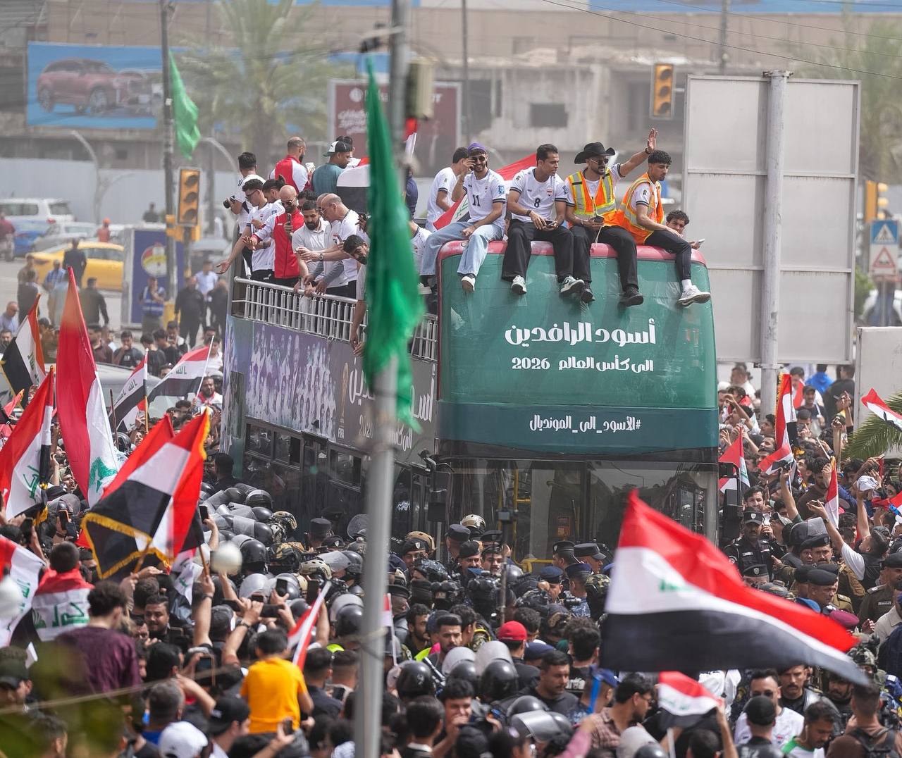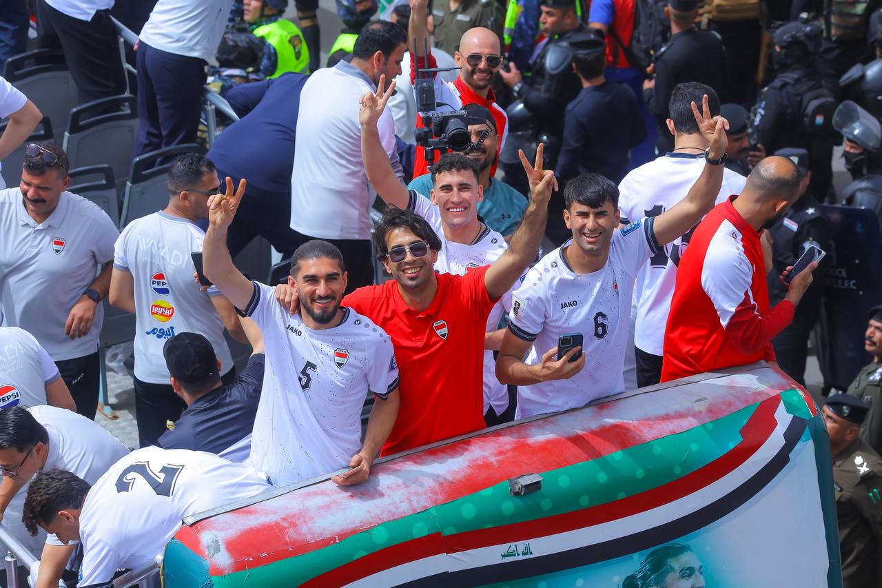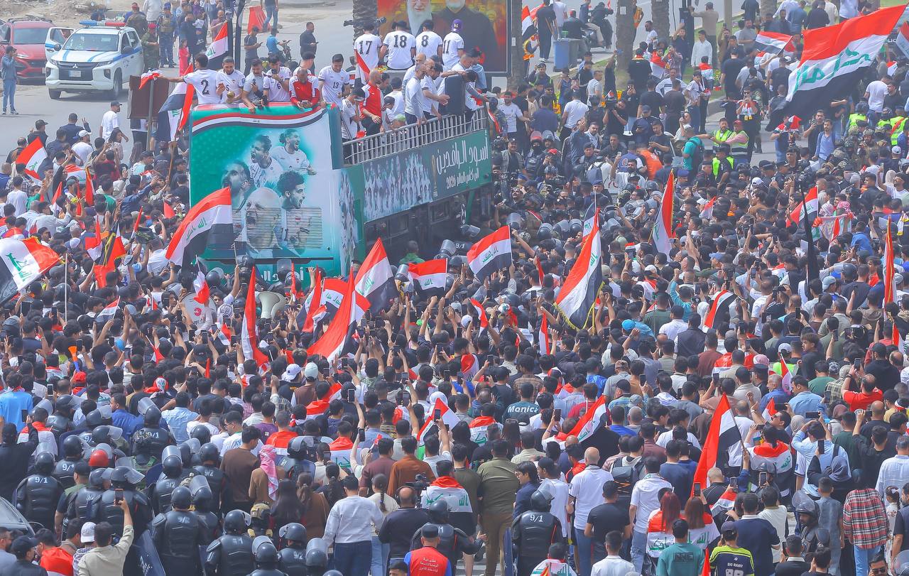 وانطلقت الحافلة المكشوفة وسط حضور جماهيري كبير، حيث احتشد الآلاف من المشجعين في الشوارع والساحات للتعبير عن فرحتهم بهذا الانجاز التاريخي، رافعين الأعلام العراقية ومرددين الهتافات الداعمة للمنتخب الوطني.