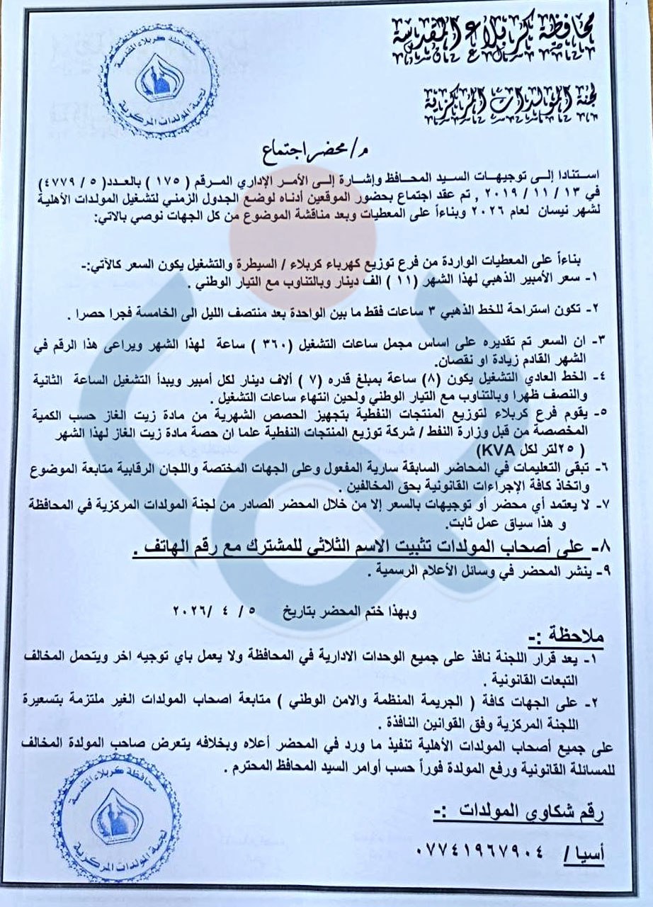 حددت حكومة كربلاء المحلية أسعار "أمبيرية" المولدات الاهلية للخطين العادي والذهبي لشهر نيسان 2026.