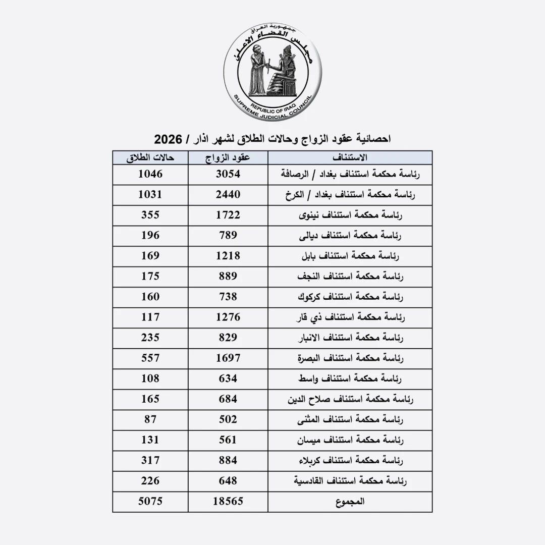 بالأرقام.. العراق يسجل أكثر من 23 ألف حالة زواج وطلاق خلال شهر آذار 2026